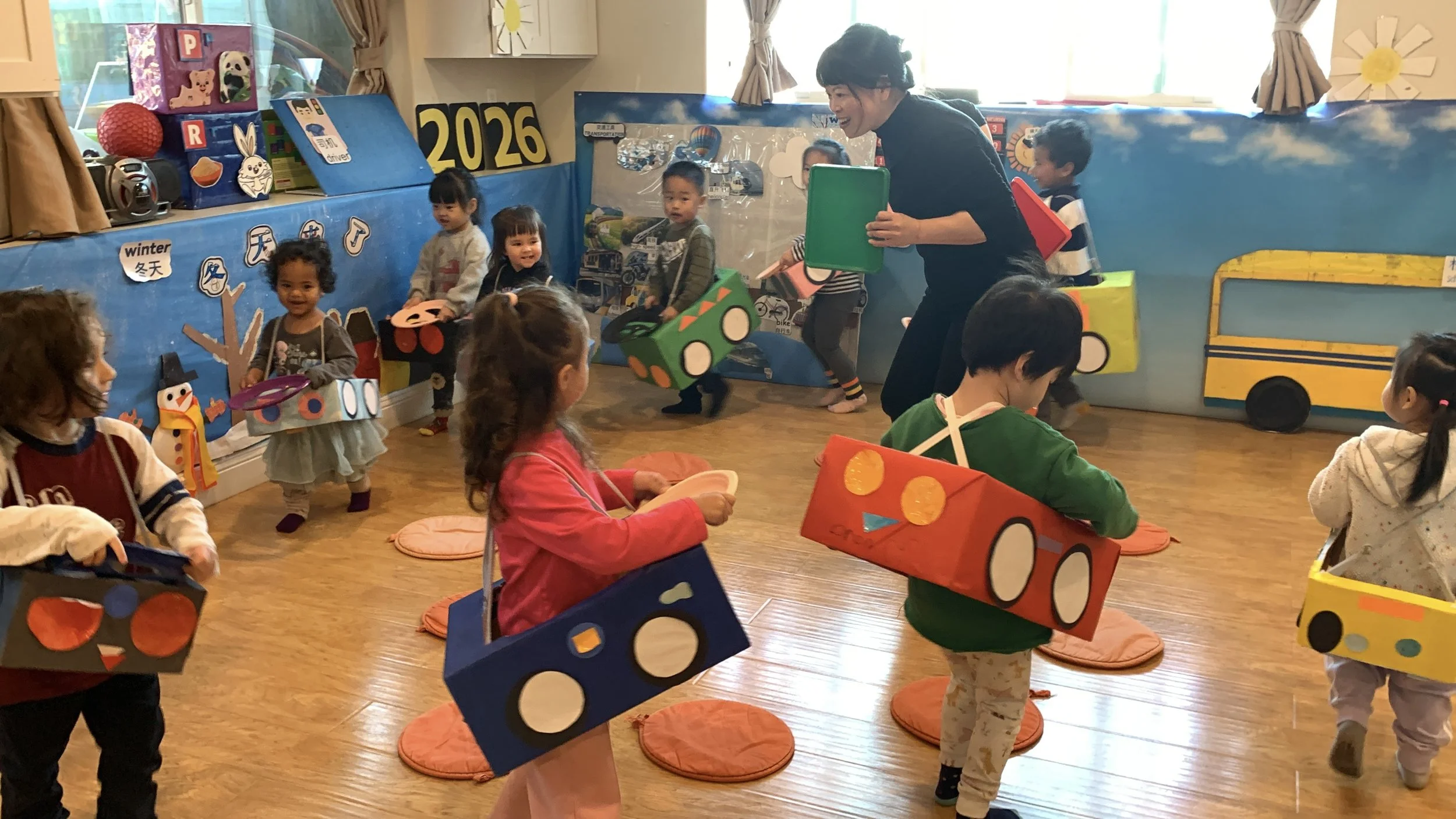 Our units are guided by “themes”— topics that are closely connected to children’s real-life experiences, such as weather, transportation, bugs and animals, jobs, nature and gardening, and trash sorting. Teachers use colorful, recycled, and open-ended materials to design unique arts and crafts projects that encourage creativity and exploration. We also extensively integrate music into the learning process, teaching the children to sing and dance to songs every circle time.